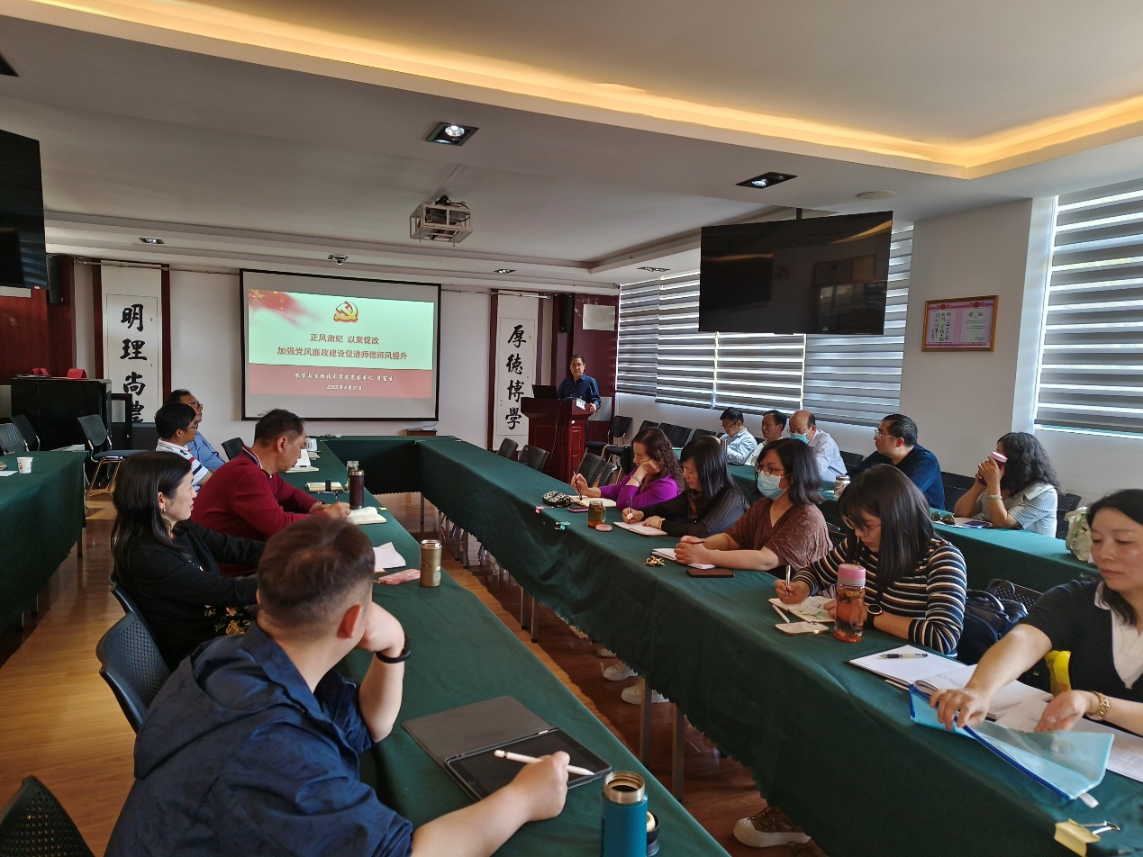接着,传达和学习了学校召开的全面从严治党暨深化推进“清廉学校”建设工作会议精神,强调了每一位教师都必须严格遵守和执行相关准则和法规。会议强调,所有教师都要有廉洁之心坚决做到清正廉洁,并针对高校师德师风存在的问题和风险点进行阐述、对教师职业行为负面清单及师德失范行为处理办法进行阐述。
