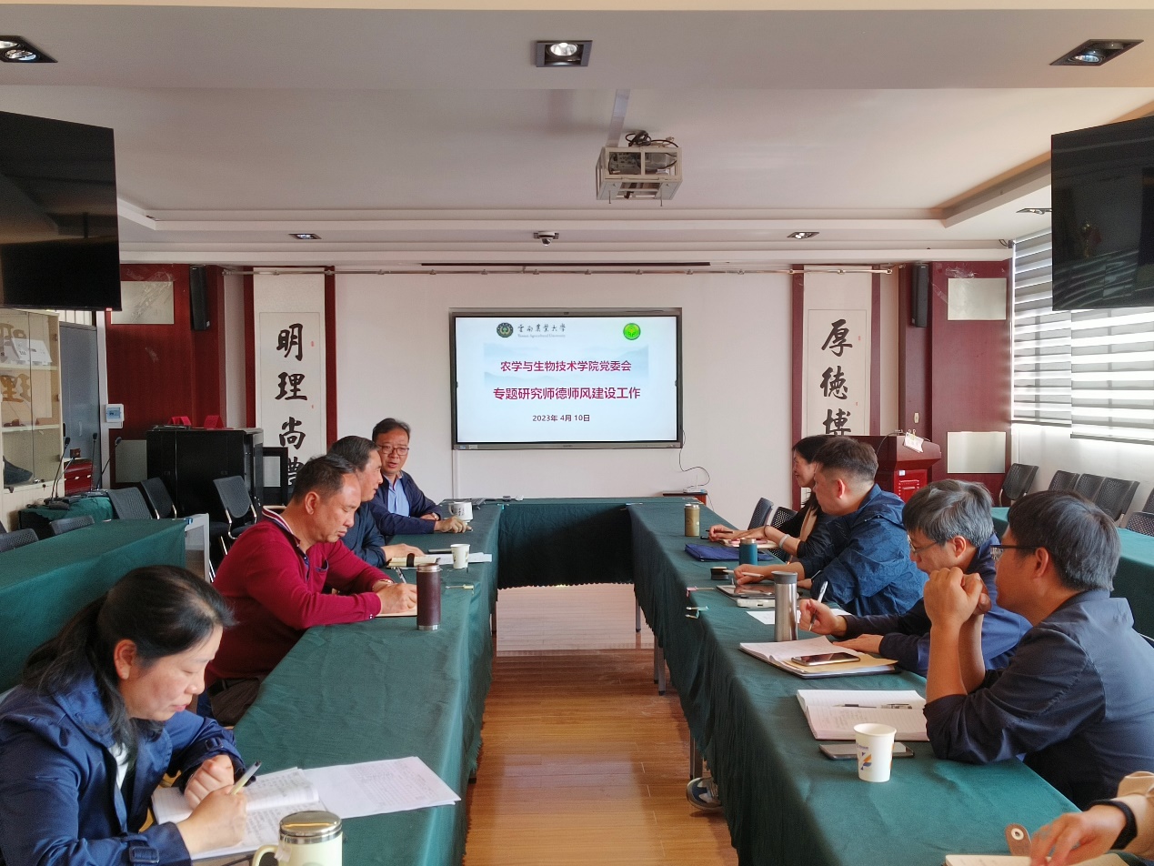为深入推进学院师德师风建设,结合推进“清廉学校”建设,加深教师的职业道德观念,严明政治纪律和工作作风,引领教师争做“有理想信念、有道德情操、有扎实知识、有仁爱之心”的“四有”好教师,推动学院师德师风建设工作取得实效。2023年4月10日上午,农学院党委召开了关于师德师风建设工作的专题研究会,党委书记李富生、院长李建宾、组织员寸湘琴、委副书记安瞳昕党、副院长周平、副院长文建成,和工会主席龙华参加了会议。会议由李富生书记主持并研讨并形成了学院师德师风建设工作方案框架,将由院工会和党政办合力制定具可行性的实施方案。