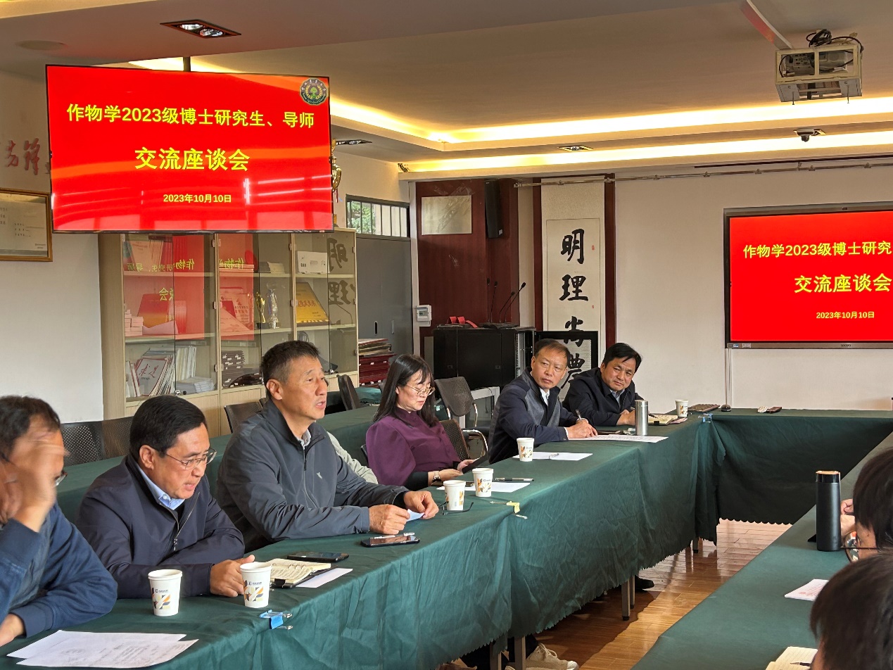 座谈会上,陈军文首先就作物学学科发展历史、学科建设、人才师资队伍及目前面临的困境等情况做了介绍。随后邀请国家自然科学基金优秀青年基金获得者杨建立教授做科研经验分享,杨建立强调读博期间应该多读文献、博士生应对研究课题了如指掌,并强调了研究材料的重要性和读博期间应有责任感和紧迫感。随后,2023级博士生就未来应如何读博和读博的目的依次发言,表示会在未来学习生活中互帮互助、践行吃苦耐劳的科研精神,坚定信仰,脚踏实地,刻苦钻研。与会博士生导师依次分享了自身博士期间的心路历程并提出如何读好博士的相关建议和要求。