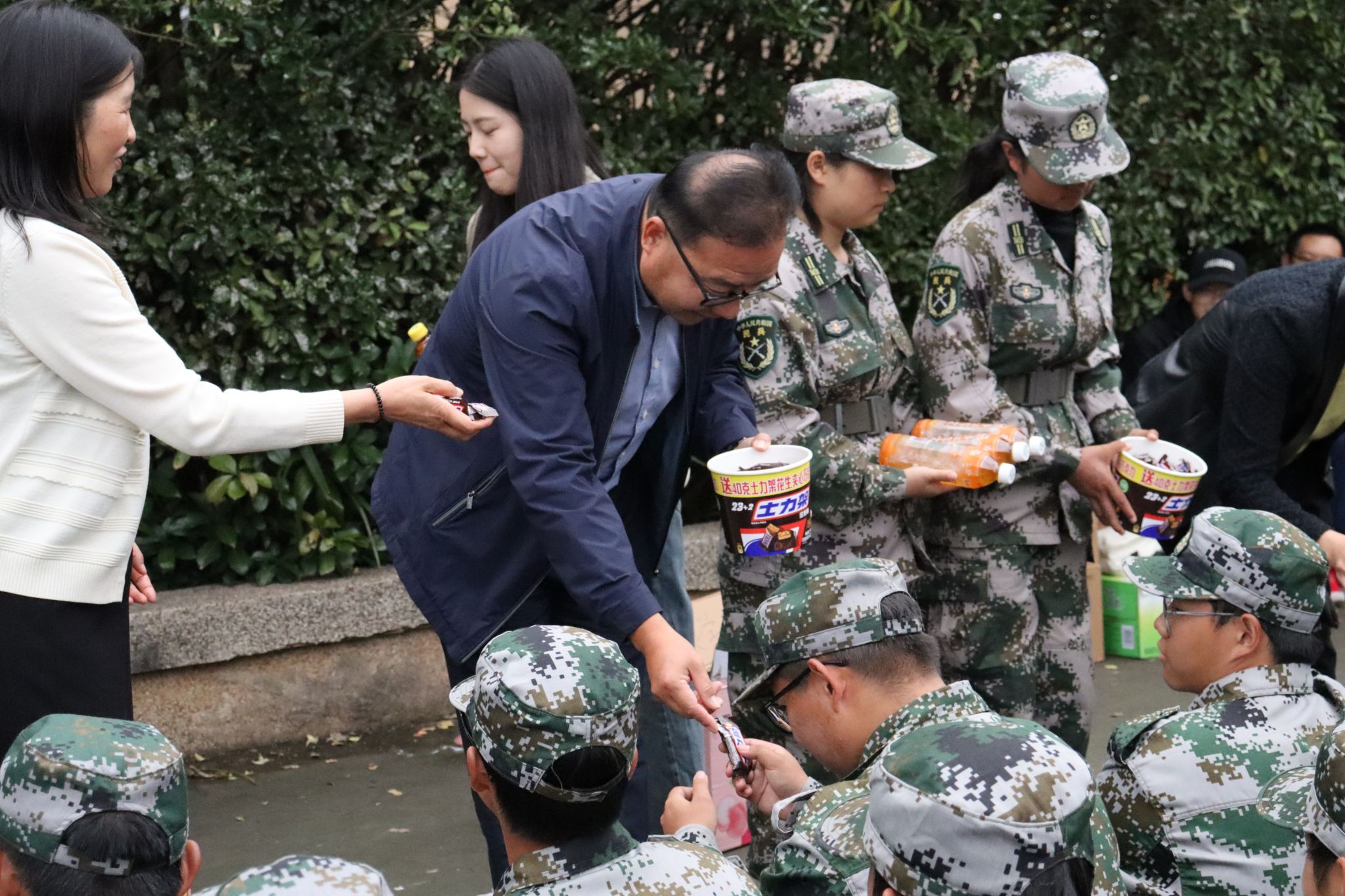 安曈昕老师和寸湘琴老师为同学们发放慰问品, 新生班主任、辅导员与学生近距离沟通交流,了解他们军训的具 体情况。此次军训慰问活动,不仅让同学们在艰苦的训练中感受到了学院的关怀和支持,也进一步鼓舞了他们的士气,增强了他们的团队凝聚力。