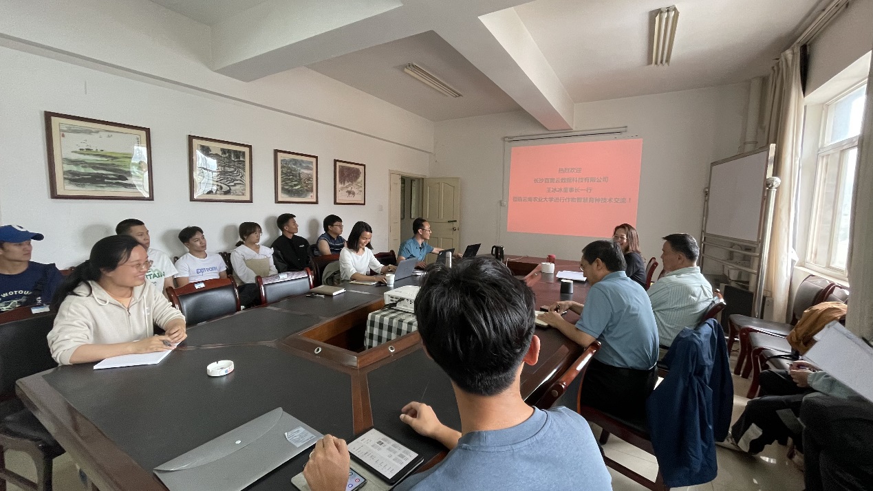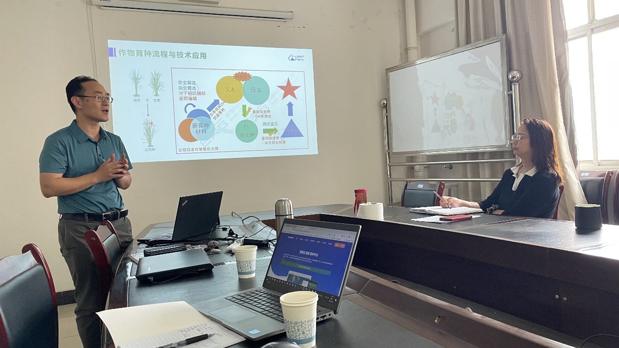 王冰冰博士从作物育种技术1.0至4.0四个层次为引,从传统育种到现代分子育种技术,围绕作物种质资源、育种表型数据采集分析、关键性状发掘建模、全基因组选择等方面,对作物智能育种技术进行了交流分享。随后,李富生书记就学院整体情况以及智慧育种重点实验室平台、科研项目、专业建设做介绍,希望加强与百奥云数据科技有限公司进一步校企合作,联合开展项目申报、技术交流和人才引进,进而提升逼喱逼喱